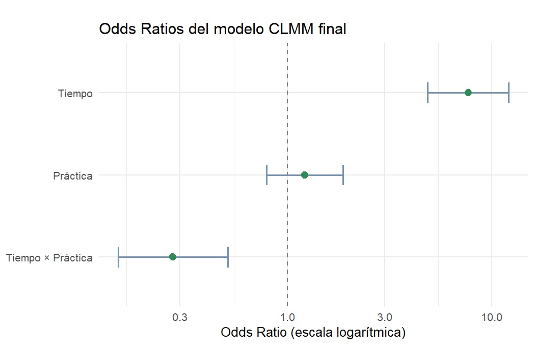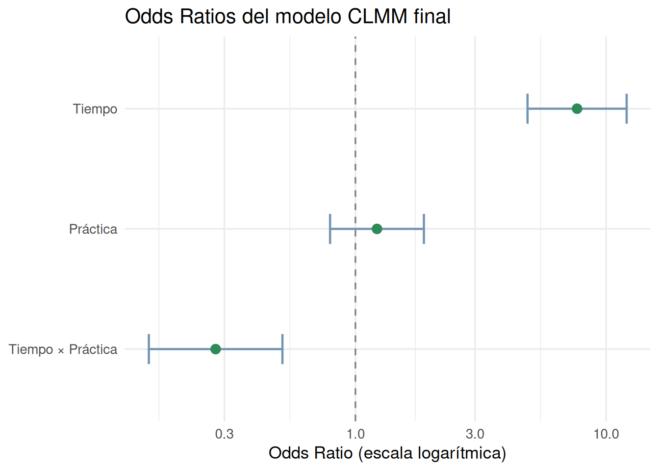 Post (OR = 2.96, IC: 1.92 – 4.59): después del taller, las chances de estar en una categoría más alta son casi 3 veces mayores en la Práctica A que en la B. Esto es consistente con lo que vimos en el gráfico descriptivo: la Práctica A pasó de un 12% a un 59% en la categoría “Implementé”, mientras que la Práctica B tuvo un cambio mucho más pequeño.