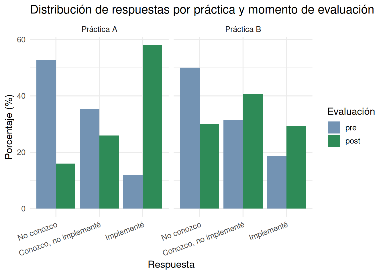 Podemos ver que para ambas prácticas disminuye el porcentaje de respuestas “No conozco” luego de la capacitación y también aumenta el porcentaje de respuestas “Implementé”. A su vez, los patrones de cambio entre el pre y post no parecen ser iguales entre ambas prácticas.
